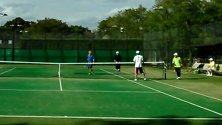 主に水曜日、木曜日、日曜日のお昼過ぎから、テニスを楽しんでいます。初級から中級者まで、年齢は20代〜70代まで、幅広く参加しています。ウォーミングアップ後、ダブルスの試合となります。